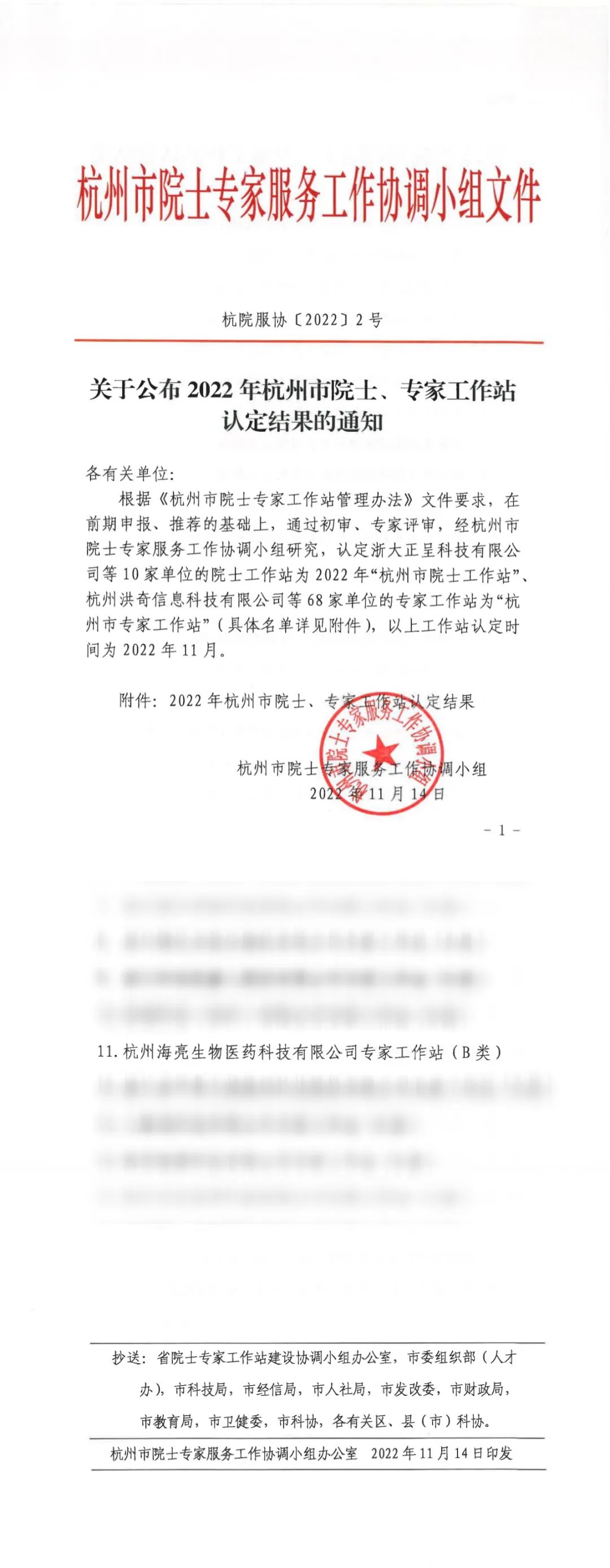 11月14日,杭州市院士專(zhuān)家服務(wù)工作協(xié)調(diào)小組發(fā)布《關(guān)于公布2022年杭州市院士、專(zhuān)家工作站認(rèn)定結(jié)果的通知》,杭州海亮生物醫(yī)藥科技有限公司專(zhuān)家工作站被正式認(rèn)定為“杭州市專(zhuān)家工作站”