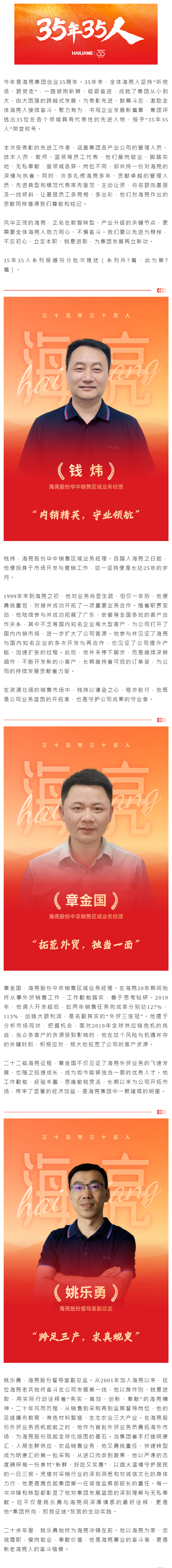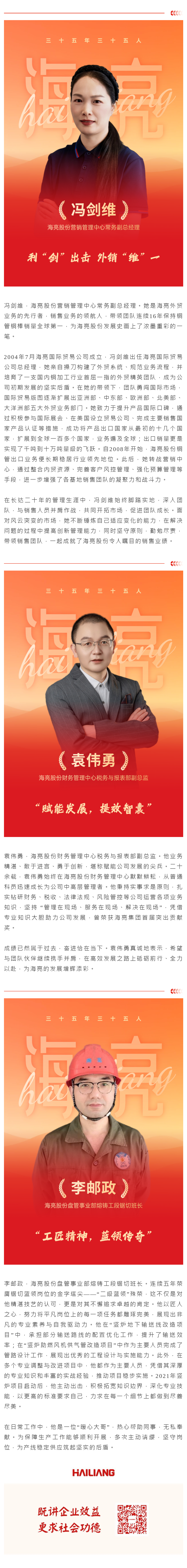 今年是海亮集團(tuán)創(chuàng)業(yè)35周年。35年來,全體海亮人堅持“聽黨話、跟黨走”,一路披荊斬棘、砥礪奮進(jìn),成就了集團(tuán)從小到大、由大圖強的跨越式發(fā)展。為表彰先進(jìn)、鼓舞斗志,激勵全體海亮人接續(xù)奮斗、聚力有為,書寫企業(yè)發(fā)展新篇章,集團(tuán)評選出35位在各個領(lǐng)域具有代表性的先進(jìn)人物,授予“35年35人”榮譽稱號。